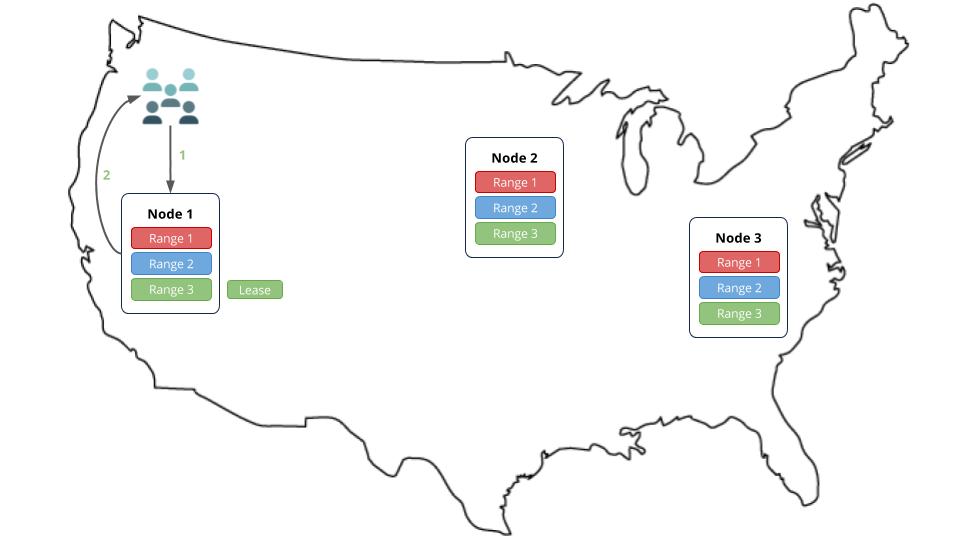 This increases the speed of reads, but it doesn't guarantee that the range lease will be anywhere close to the origin of requests. If requests are coming from the US West, for example, and the relevant range lease is on a node in the US East, the requests would likely enter a gateway node in the US West and then get routed to the node with the range lease in the US East.